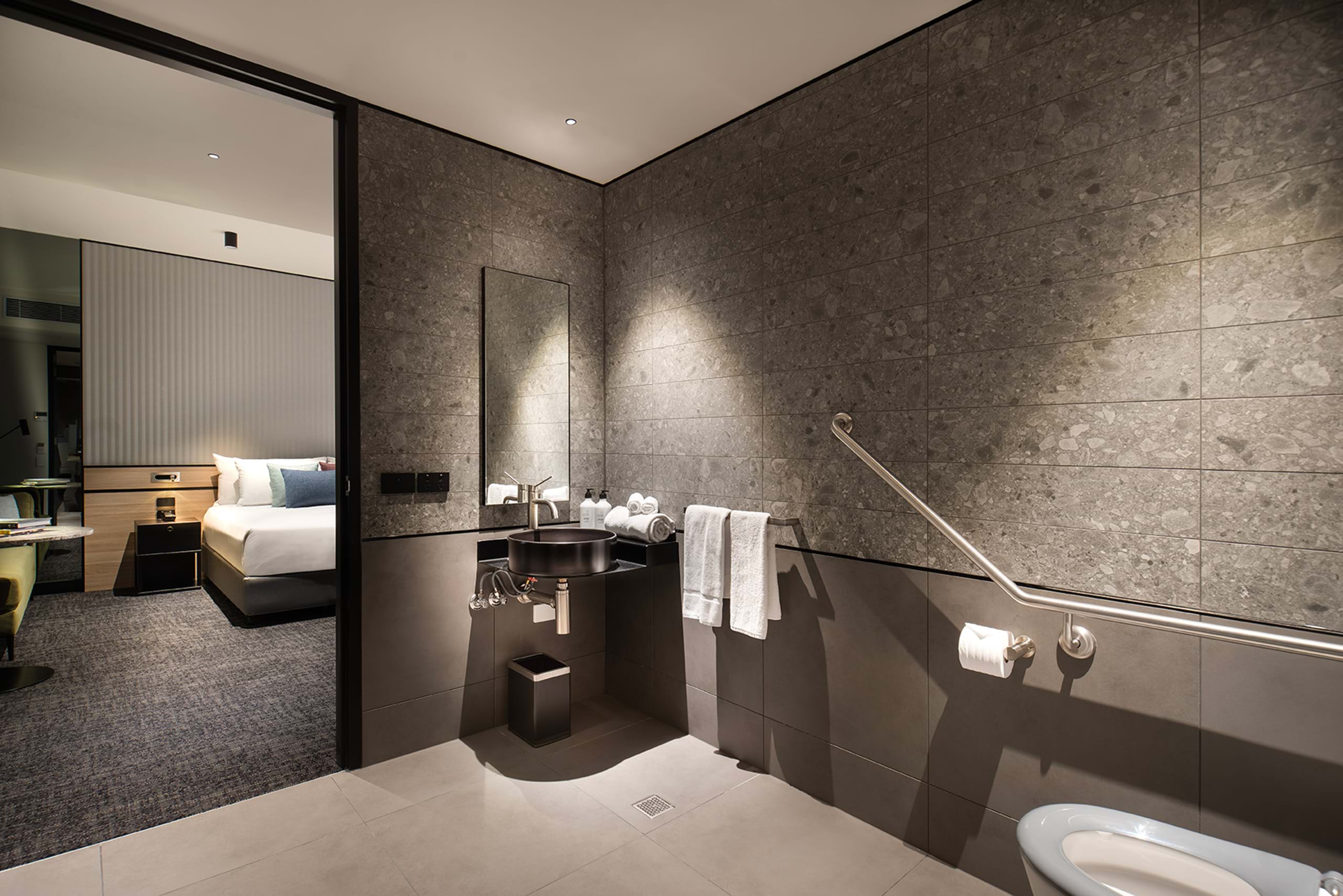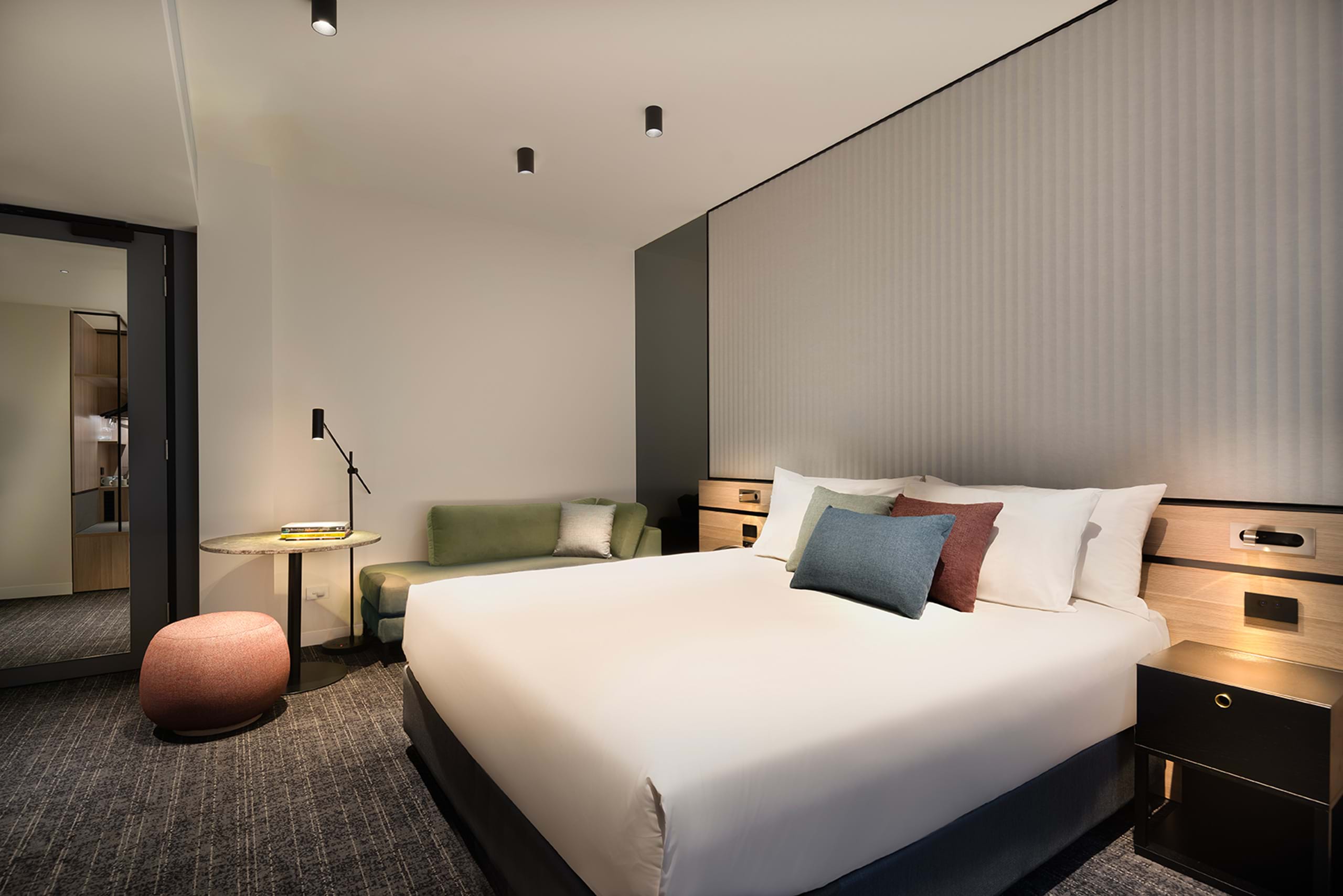 An urban experience with important layers of accessibility and ease, with details designed with room to move. A plush designer chaise lounge, chair and table, sumptuous bed, luxury linen and pillows, and a contemporary spacious bathroom. Discover a twist on the traditional mini-bar stocked with locally sourced provisions.